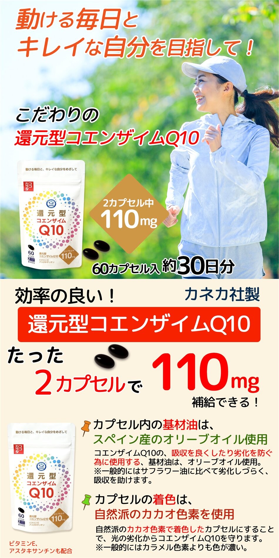 「ココカラダ 還元型コエンザイムQ10 110mg 60カプセル」は、カネカ社製の還元型コエンザイムQ10を、1日2カプセル中に110mg配合し、さらにビタミンEやアスタキサンチンも配合しました。