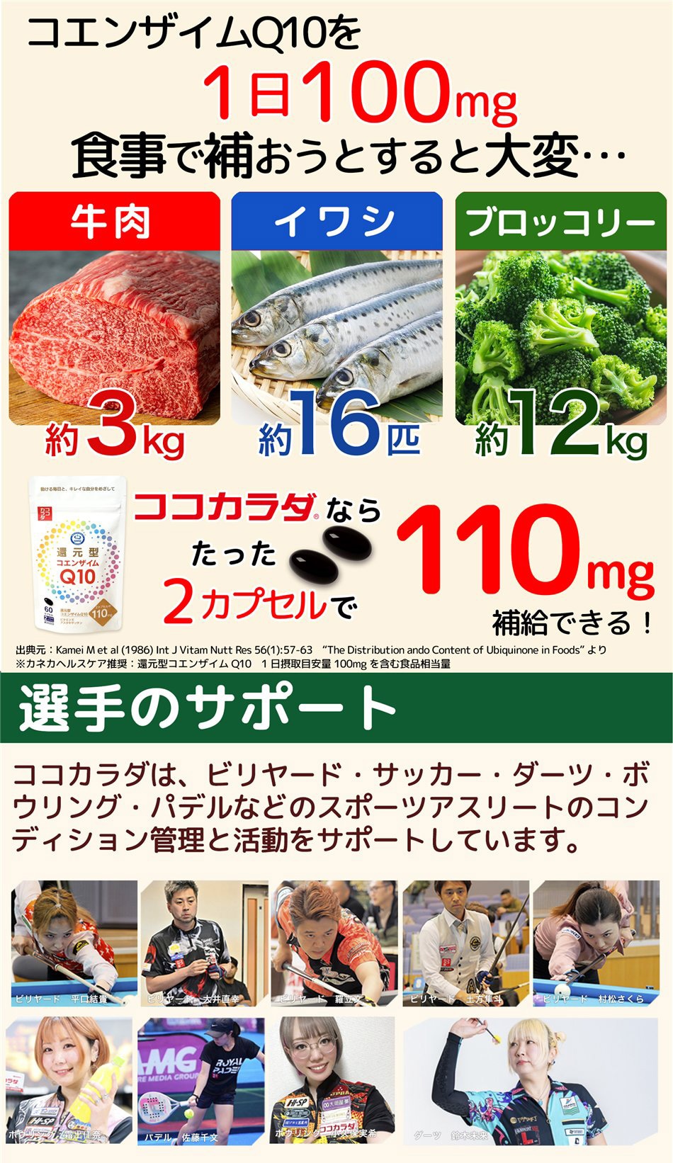 ●たったの2カプセルでカネカ社製の原料を使用した、「還元型コエンザイムQ10」を110mg補給できる。