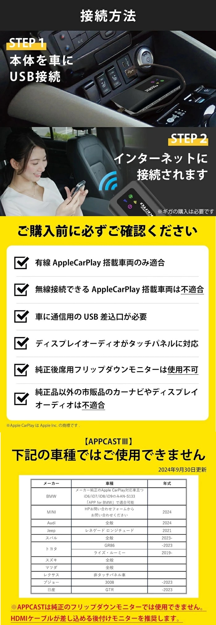 ※本製品が対応する車両は、有線のApple Car Playに対応しているメーカー純正のディスプレイオーディオ搭載車に限られます。