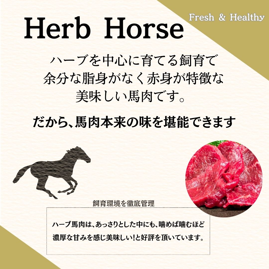 ●ハーブを中心に育てる飼育方で余分な脂身がない赤身が特徴な馬肉です。