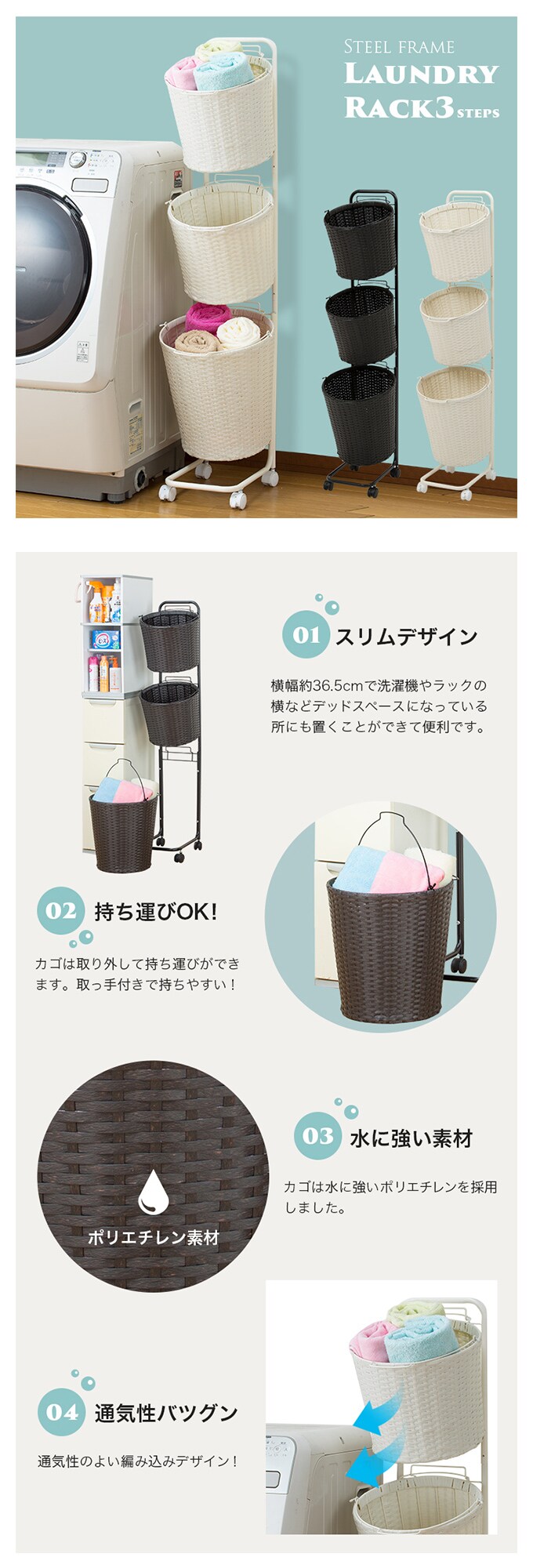 - 【ダークブラウン】スチールフレームランドリーラック 3段