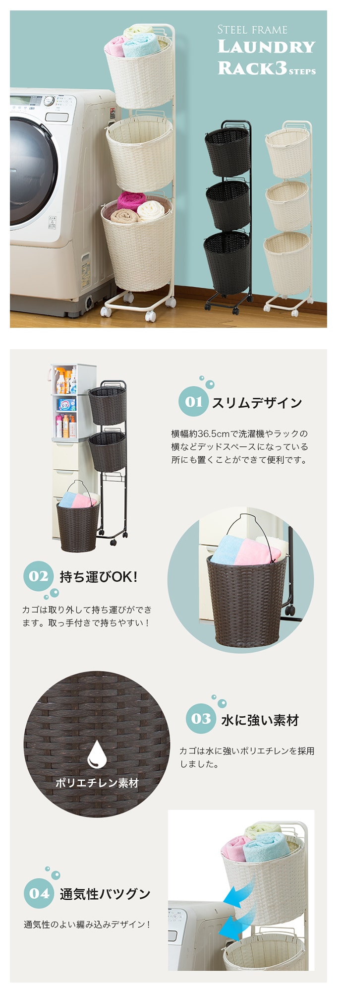 【ホワイト】スチールフレームランドリーラック 3段 | 洗濯物を仕分けできるランドリーバスケットラック