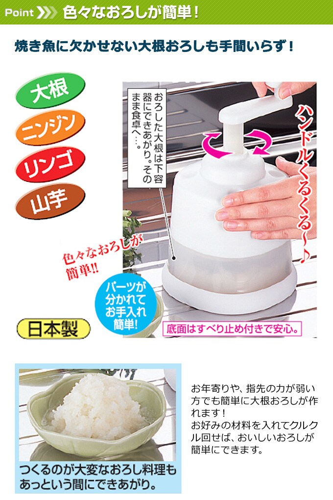 お年寄りや指先の力が弱い方でも簡単に大根おろしが作れます。