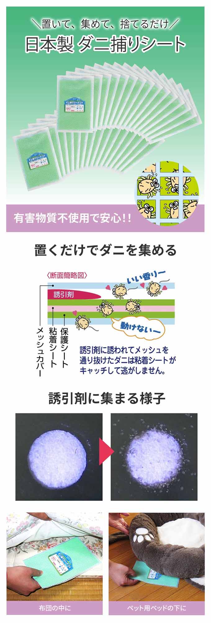 置いて、集めて、捨てるだけとっても簡単。ダニ捕りシートでダニ対策。置くだけでダニを集めて一網打尽。有害物質不使用で安心。湿気の多い場所やホコリの溜まりやすい場所に置くだけ。特殊な誘引剤に誘われたダニがシートの中に入り、強力粘着剤がしっかりキャッチし死滅するので飛散の心配もありません。押し入れ、ペット用マット、車のシート、便利なお取り替え日シール付きです。