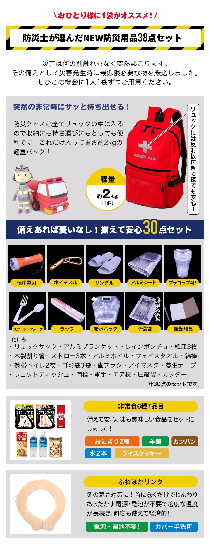 - 防災士が選んだオリジナル防災用品38点セットDX【30点セット+食料飲料×7+ふわぽかリング×1】