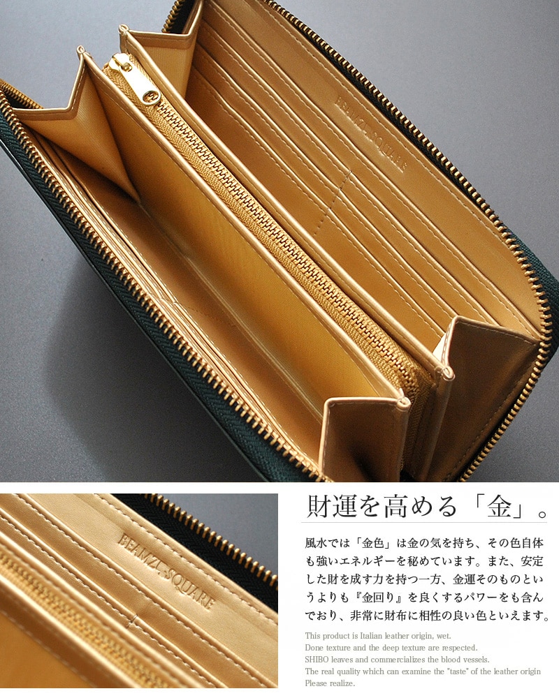- 【グリーン×ゴールド】BEAMZSQUARE 牛革ラウンドファスナー 長財布 BS-15805GRN