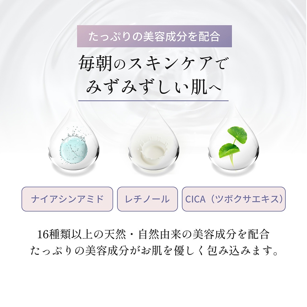 ・原材料/材質/素材:水、グリセリン、イソペンチルジオール、バクチオール、セラミドEOP、セラミドNG、セラミドNP、セラミドaG、セラミドaP、水添レシチン、フィトステロールズ、パルミチン酸レチノール、ツボクサエキス、BG、ソルビトール、ナイアシンアミド、カミツレ花エキス、セイヨウォトギリソウ花/葉/茎エキス、トウキンセンカ花エキス、フユボダイジュ花エキス、ヤグルマギク花エキス、ローマカミツレ花エキス、レシチン、セイヨウシロヤナギ樹皮エキス、タイサンボク葉エキス、オウゴン根エキス、イタドリ根エキス、カンゾウ根エキス、チャ葉エキス、ローズマリー葉エキス、カミツレ花エキス、テトラへキシルデカン酸アスコルビル、トコフェロール、パンテノール、ピーナッツ油、スクワラン、クエン酸Na、クエン酸、キサンタンガム、ポリソルベート80、メチルパラベン、フェノキシエタノール