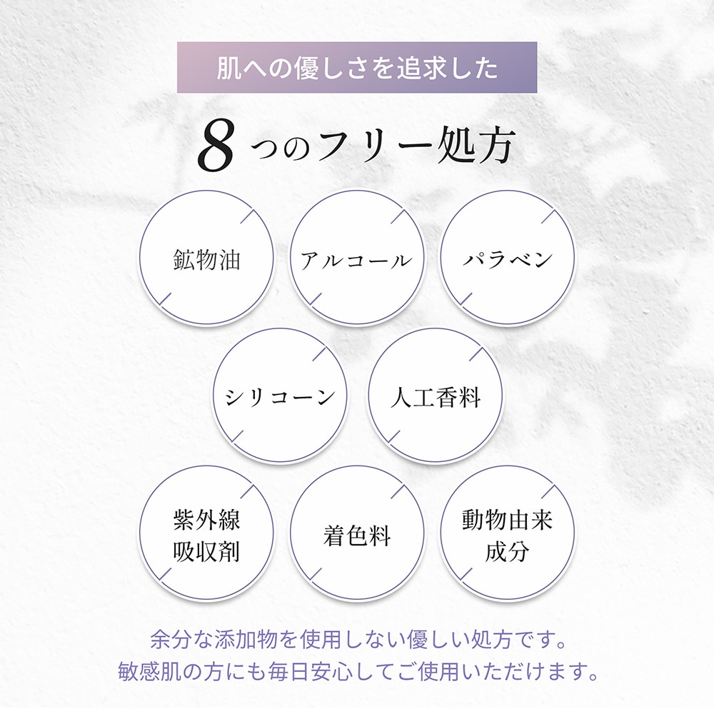 ・原材料/材質/素材:水、グリセリン、イソペンチルジオール、バクチオール、セラミドEOP、セラミドNG、セラミドNP、セラミドaG、セラミドaP、水添レシチン、フィトステロールズ、パルミチン酸レチノール、ツボクサエキス、BG、ソルビトール、ナイアシンアミド、カミツレ花エキス、セイヨウォトギリソウ花/葉/茎エキス、トウキンセンカ花エキス、フユボダイジュ花エキス、ヤグルマギク花エキス、ローマカミツレ花エキス、レシチン、セイヨウシロヤナギ樹皮エキス、タイサンボク葉エキス、オウゴン根エキス、イタドリ根エキス、カンゾウ根エキス、チャ葉エキス、ローズマリー葉エキス、カミツレ花エキス、テトラへキシルデカン酸アスコルビル、トコフェロール、パンテノール、ピーナッツ油、スクワラン、クエン酸Na、クエン酸、キサンタンガム、ポリソルベート80、メチルパラベン、フェノキシエタノール