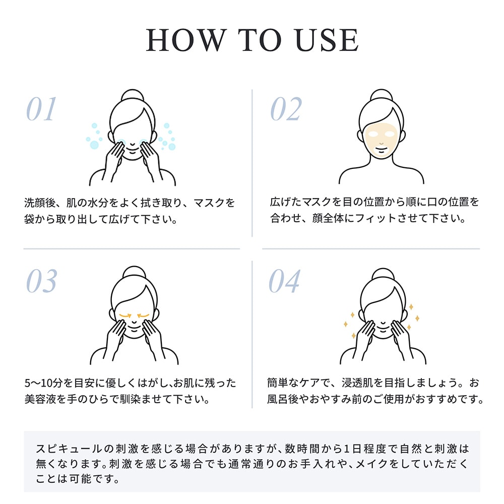 (1) 洗顔後、肌の水分をよく拭き取りきれいに整えた後、マスクを袋から取り出し広げます。