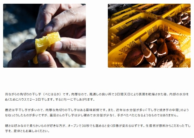 ・お召し上がり方:そのままでも十分美味しいですが、トースターで軽く炙ることで(30秒ほどで十分)さらに柔らかくなり、芋の風味が増します