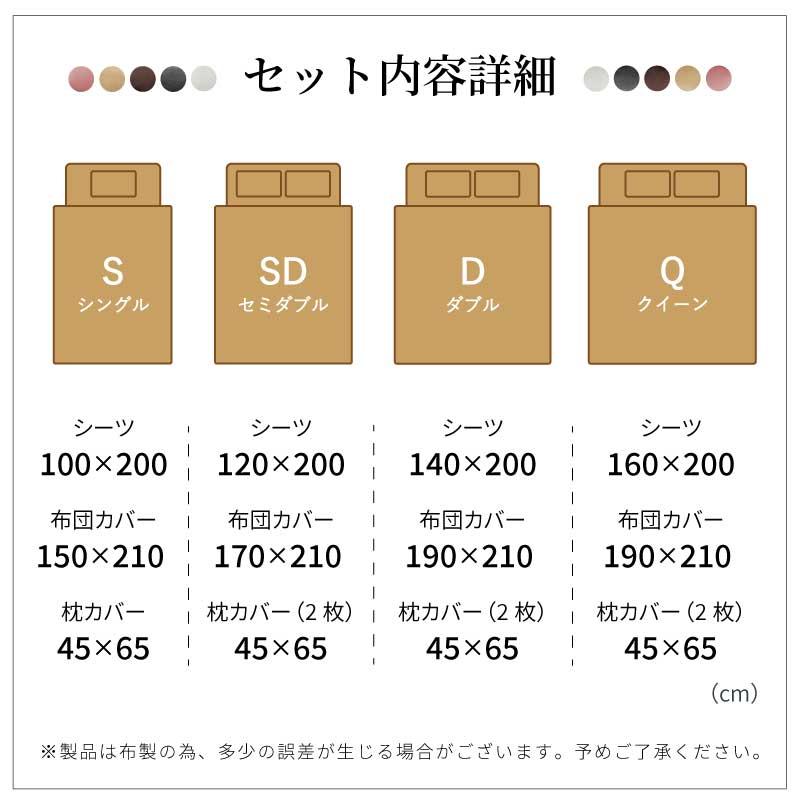 ボックスシーツ(1枚)140*200cm 掛け布団カバー(1枚)190*210cm 枕カバー(2枚)45*65cm