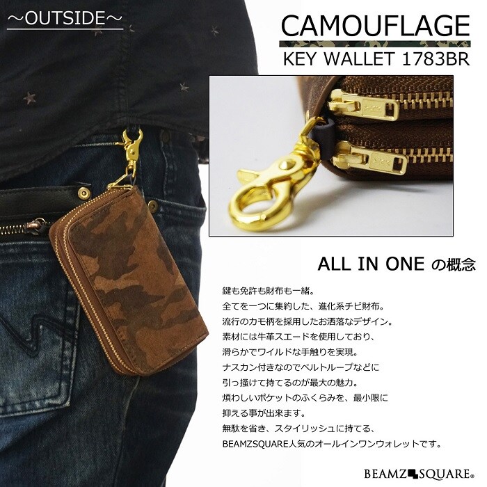 - 【ブラウン】BEAMZSQUARE 牛革スエード製 迷彩柄 マルチキーウォレット BS-1783BR