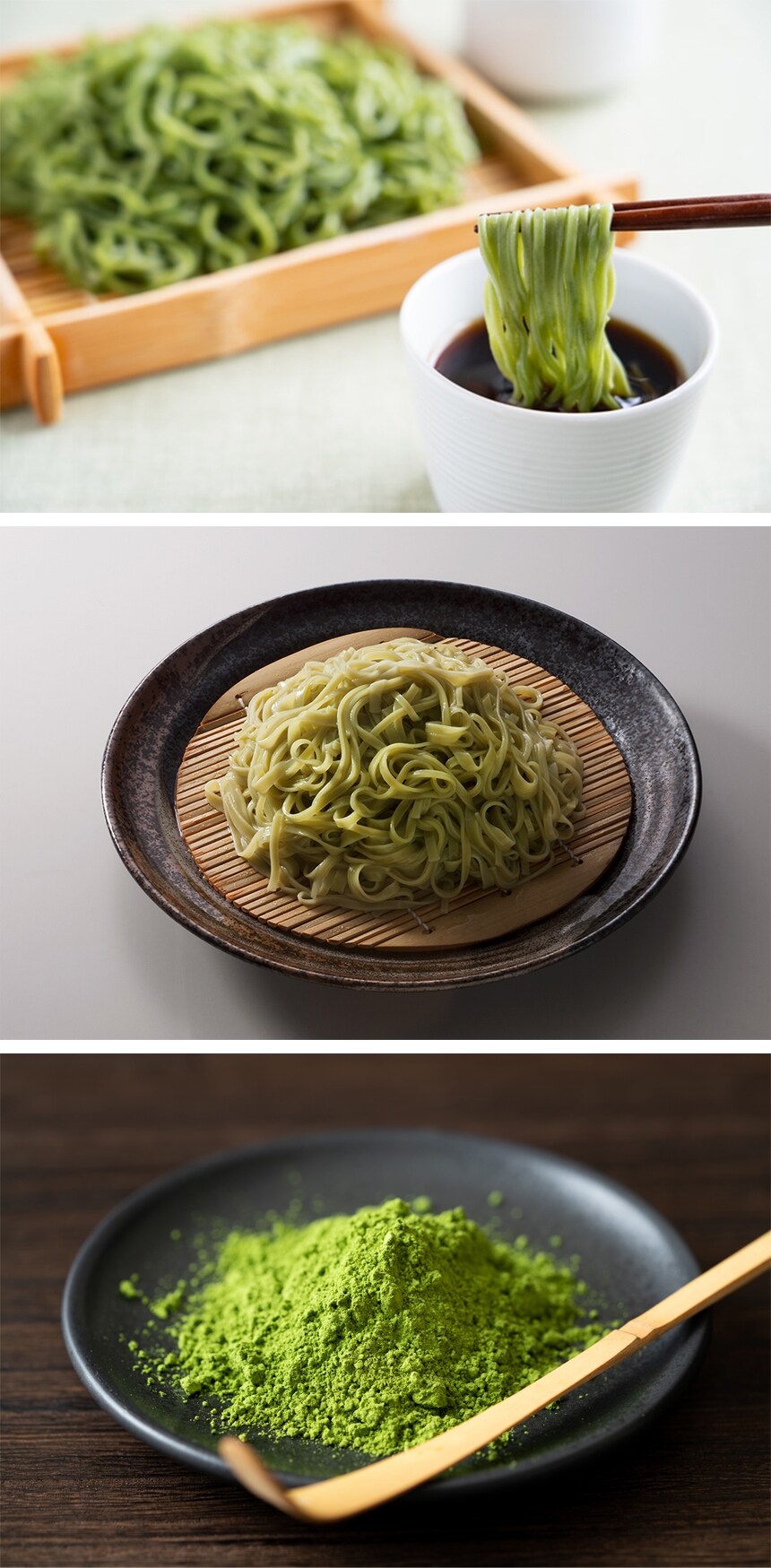 秋田県稲庭地区に三百余年の古くから継承されている伝統技法で作られる日本三大うどん「稲庭うどん」と鎌倉時代から生産されていたと考えられる日本三大茶「宇治茶」の抹茶を使用して、日本三大銘品の融合商品が誕生しました。
