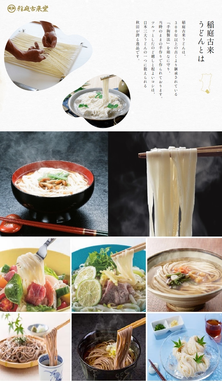 ■伝統製法で作られた『稲庭古来うどん』は、ツルッとしたのど越しと程よいコシに定評があります。