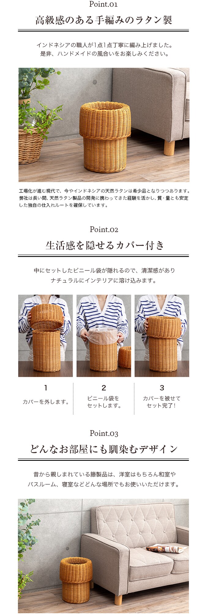 お部屋になじむラタンカバー付きダストボックス。籐製カバーを上からスポッとかぶせるだけでお洒落なまま、使い勝手のよいゴミ箱に。ビニール袋が隠れるので、清潔感がありナチュラルな雰囲気に。