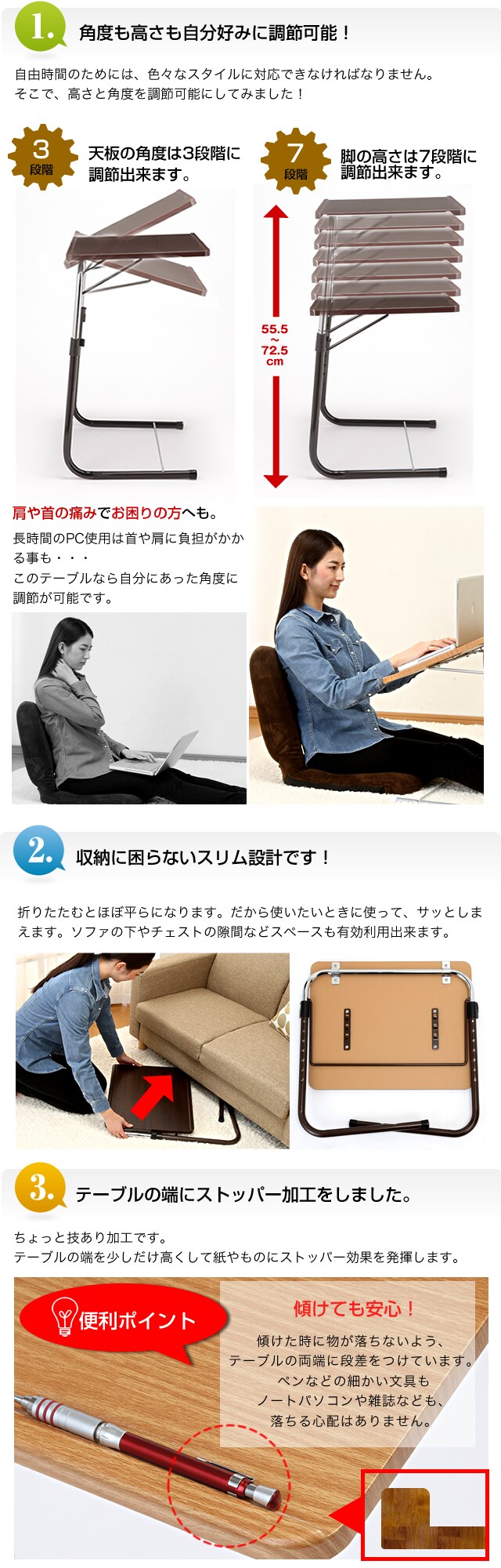 天板の角度は3段階、脚の高さは7段階に調節できます。