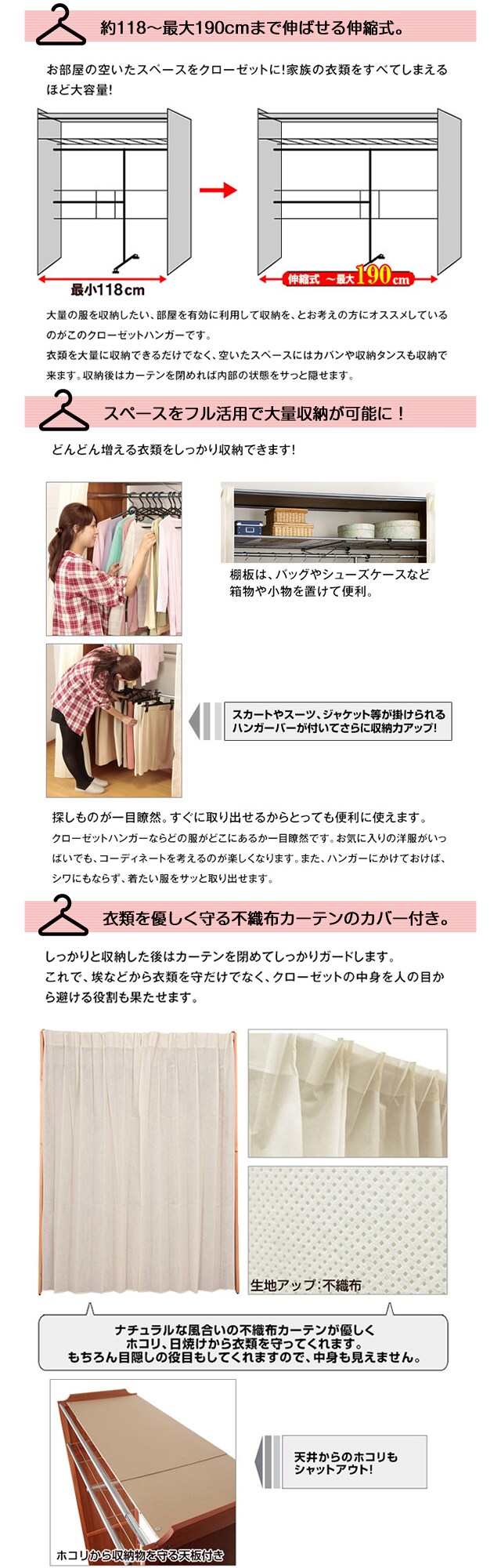 横幅が約118cm-最大190cmまで伸縮可能で奥行きも奥行55cmと余裕の収納力だから壁一面をクローゼットに模様替え♪