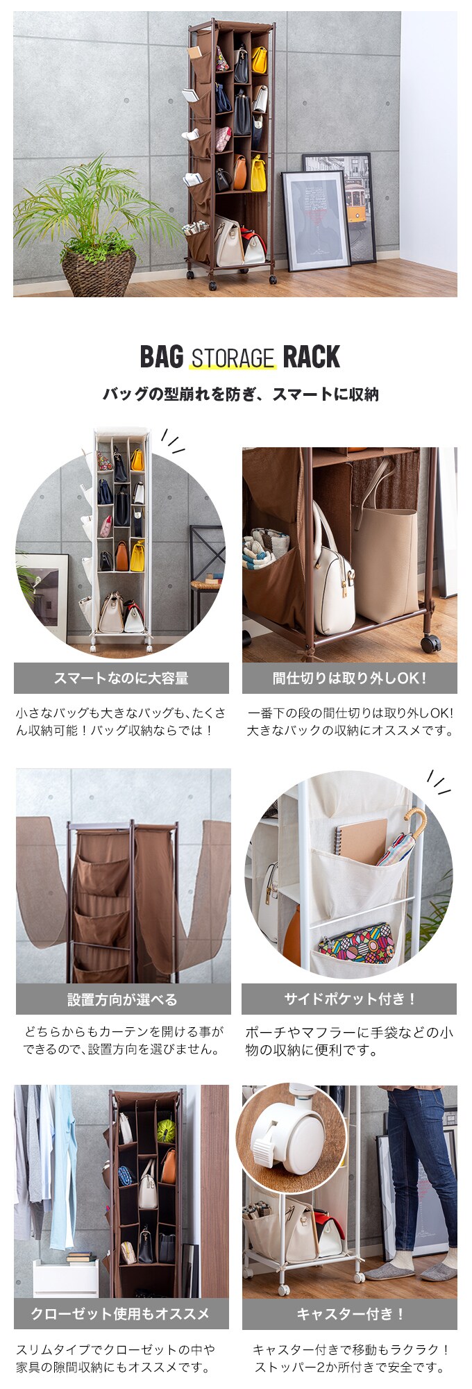 大切なバッグをホコリや日差しから守るカーテン付き、さらにキャスター付きで移動