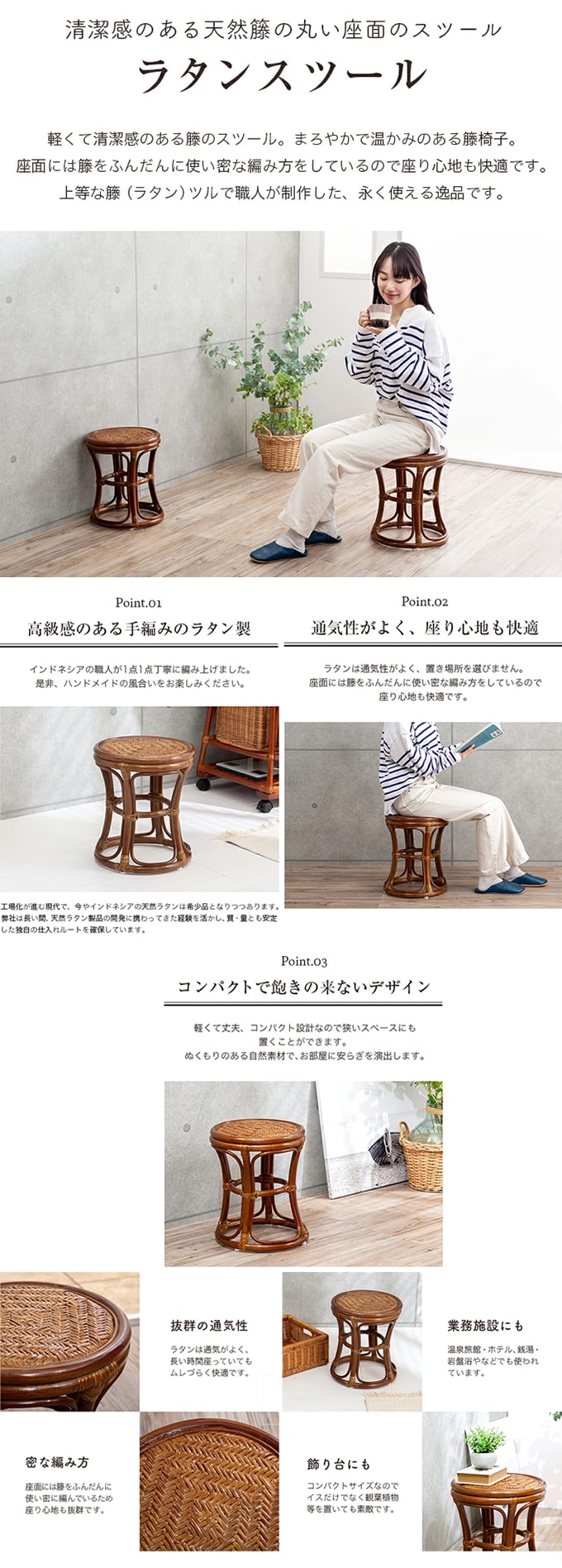 軽くて清潔感のある籐のスツール。まろやかで温かみのある籐椅子。座面には籐をふんだんに使い密な編み方をしているので座り心地も快適です。