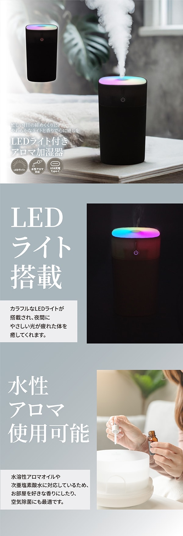 【ブラック】LEDライト付きアロマ加湿器<ミニサイズ・タンク容量370ml> | 忙しい一日の締めくくりに、やわらかなライトと香りで心に癒しを