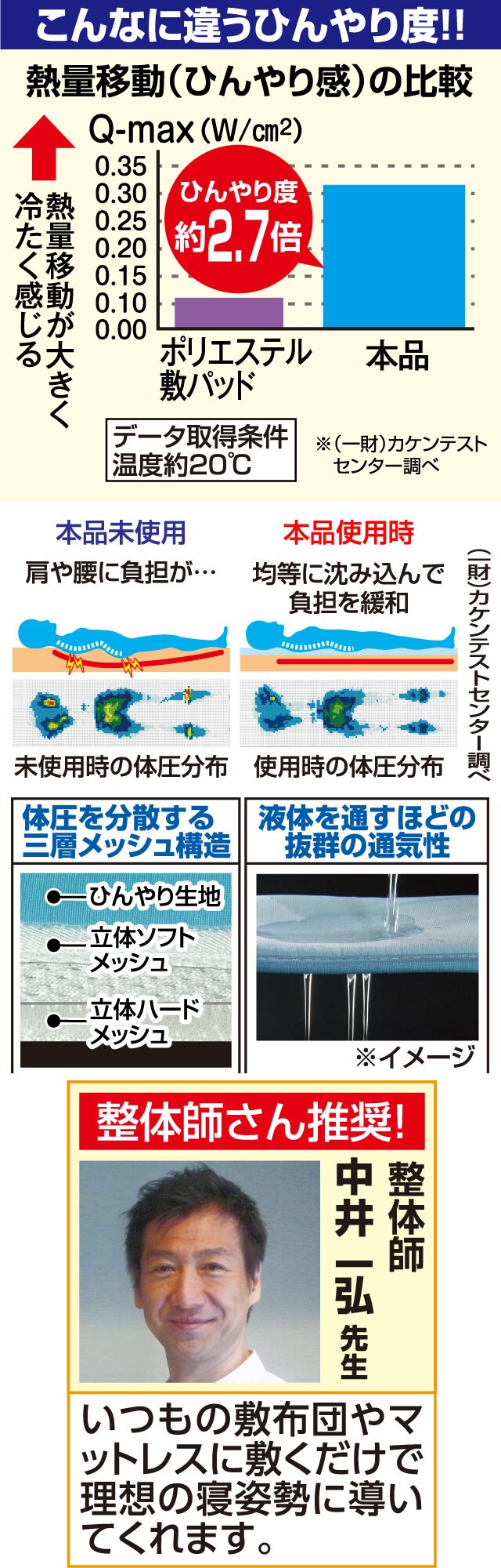 中井式三層構造ひんやり敷マット | 置くだけひんやり体圧分散トッパーマット