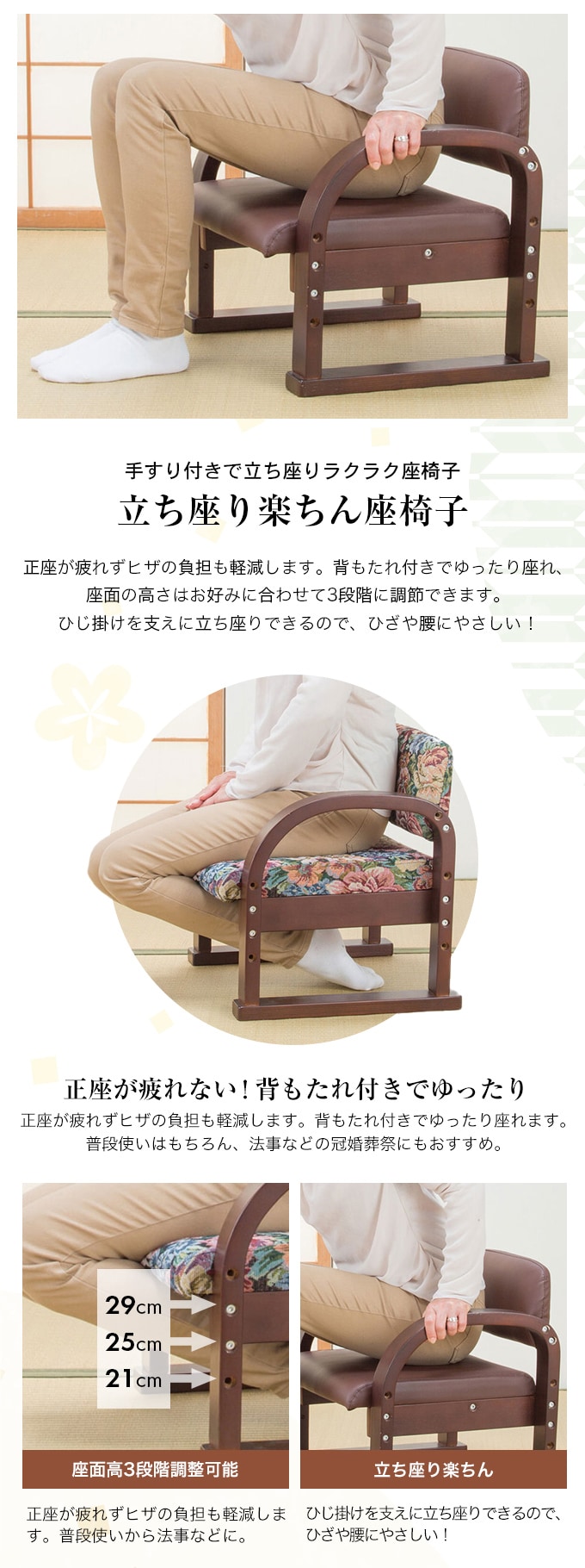 手すり付きで立ち座りラクラク座椅子。正座が疲れずヒザの負担も軽減します。背もたれ付きでゆったり座れ、座面の高さはお好みに合わせて3段階に調節できます。ひじ掛けを支えに立ち座りできるので、ひざや腰にやさしい!