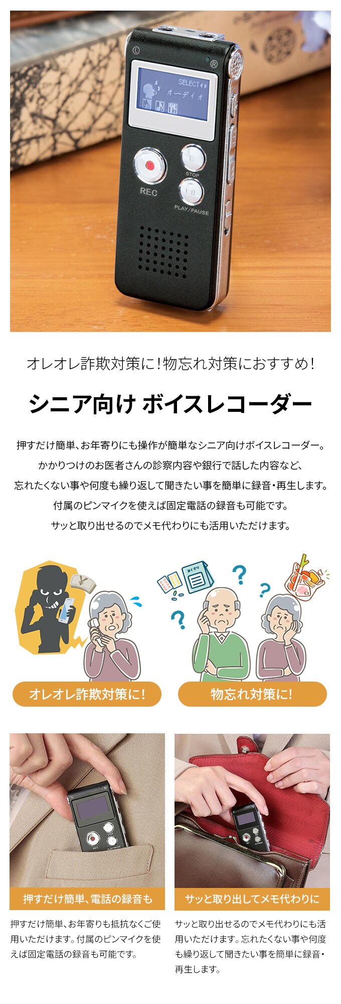 オレオレ詐欺対策に!物忘れ対策におすすめ!押すだけ簡単、お年寄りにも操作が簡単なシニア向けボイスレコーダーです。かかりつけのお医者さんの診察内容や銀行で話した内容など、忘れたくない事や何度も繰り返して聞きたい事を簡単に録音・再生します。付属のピンマイクを使えば固定電話の録音も可能です。サッと取り出せるのでメモ代わりにも活用いただけます。