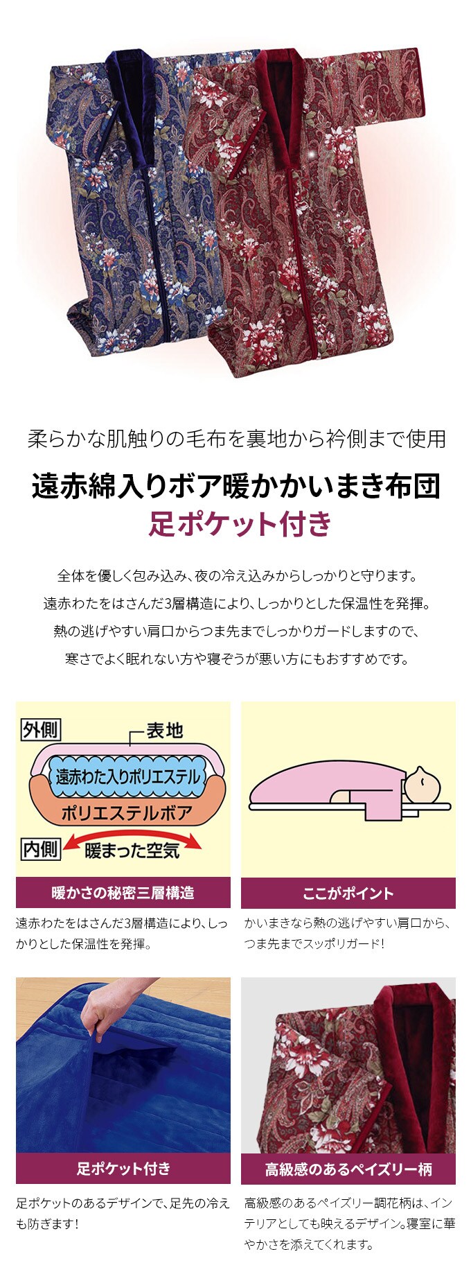 - 【ワイン】遠赤綿入りボア暖かかいまき布団 足ポケット付き
