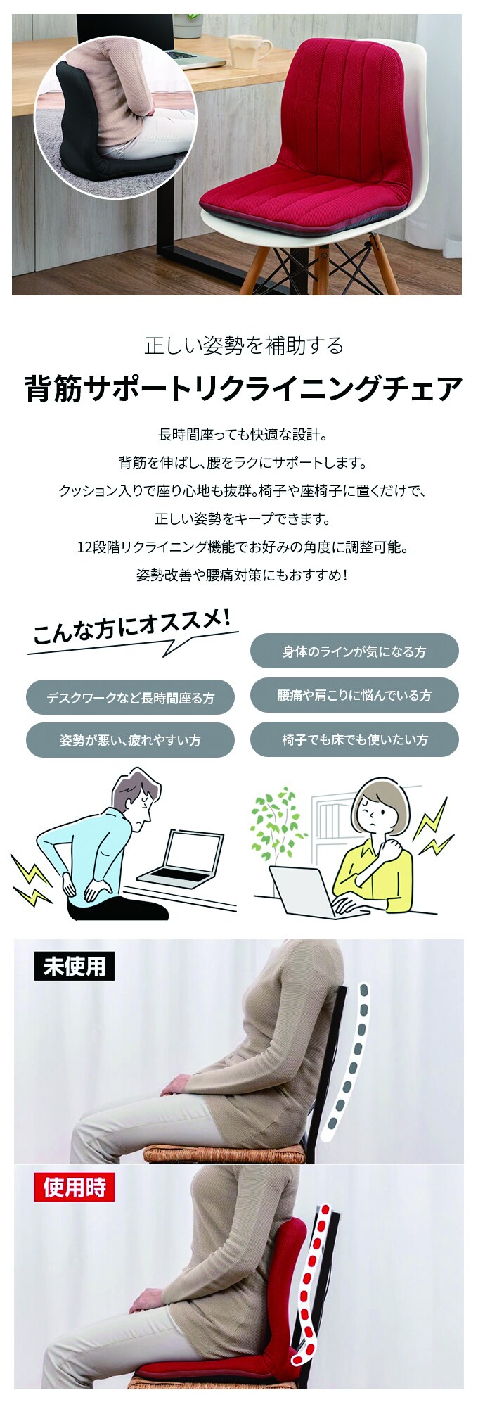 座椅子やチェアの上に置くだけ!背もたれをしっかりサポートします。正しい姿勢を保つことで、骨盤を立たせて姿勢を改善。背筋サポートリクライニングチェアは、12段階リクライニング機能を搭載。お好みの角度に調整できます。また、座椅子としても使用可能で、家族全員でシェアできる利便性も魅力です。このチェアで快適さと健康を手に入れましょう。身近な場所に配置すれば、いつでも使いたい時に楽な姿勢をサポートします。姿勢改善や腰痛対策としてもおすすめです。