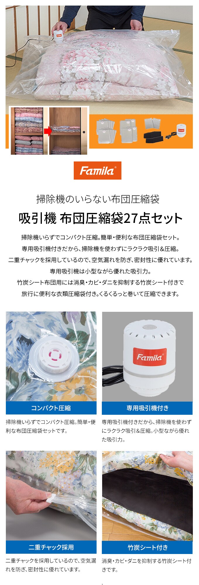 掃除機いらずでコンパクト圧縮。簡単・便利な布団圧縮袋セット。専用吸引機付きだから、掃除機を使わずにラクラク吸引&圧縮。二重チャックを採用しているので、空気漏れを防ぎ、密封性に優れています。専用吸引機は小型ながら優れた吸引力。竹炭シート布団用には消臭・カビ・ダニを抑制する竹炭シート付きで旅行に便利な衣類圧縮袋付き。くるくるっと巻いて圧縮できます。