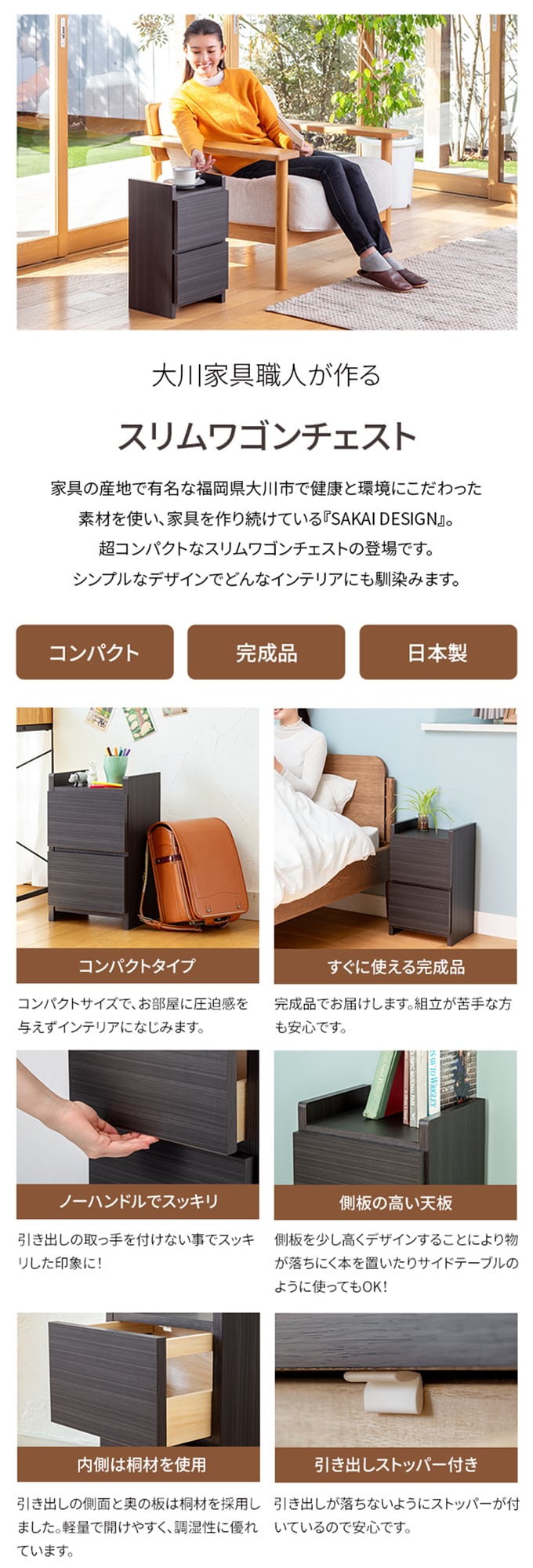 【2段】職人が作るスリムワゴンチェスト<完成品> | 面倒な組み立てはなく完成品でお届け!