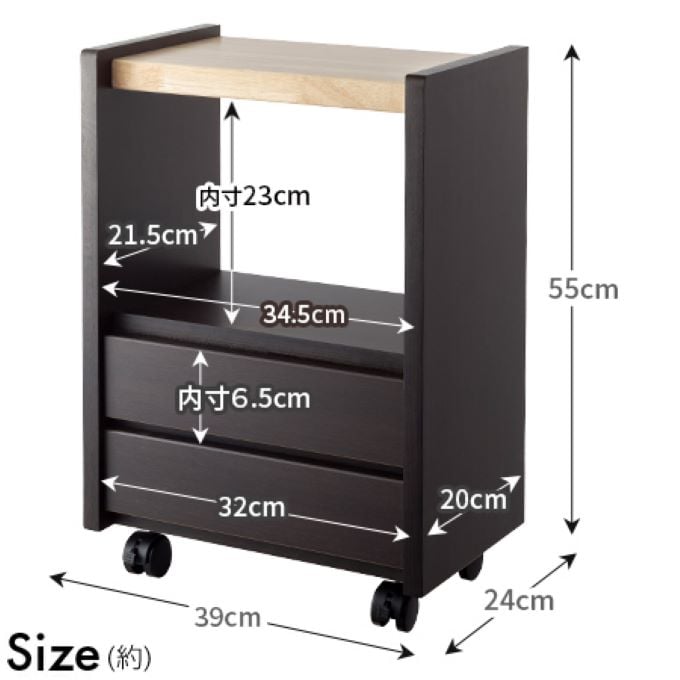 ・商品サイズ:約幅39×奥行き24×高さ55cm(キャスター含む)、引き出し内寸:約幅32×奥行き20×高さ6.5cm、オープンスペース内寸:約幅34.5×奥行き21.5×高さ23cm