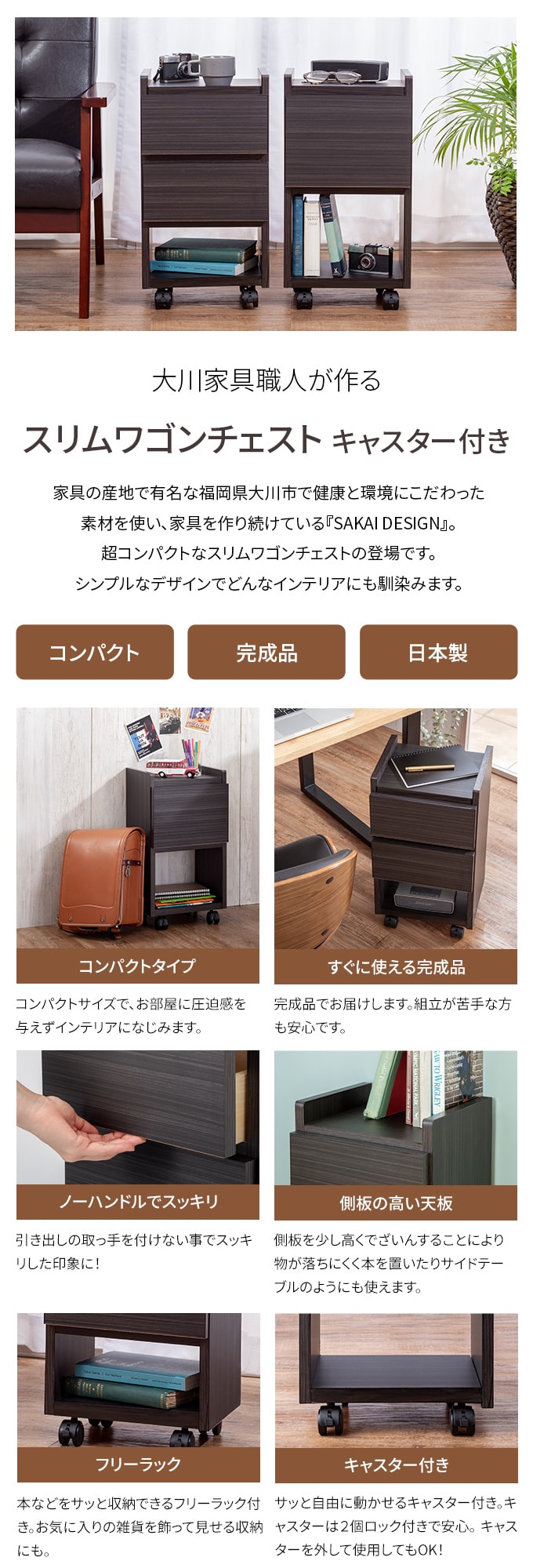 - 【2段・キャスター付き】職人が作るスリムワゴンチェスト
