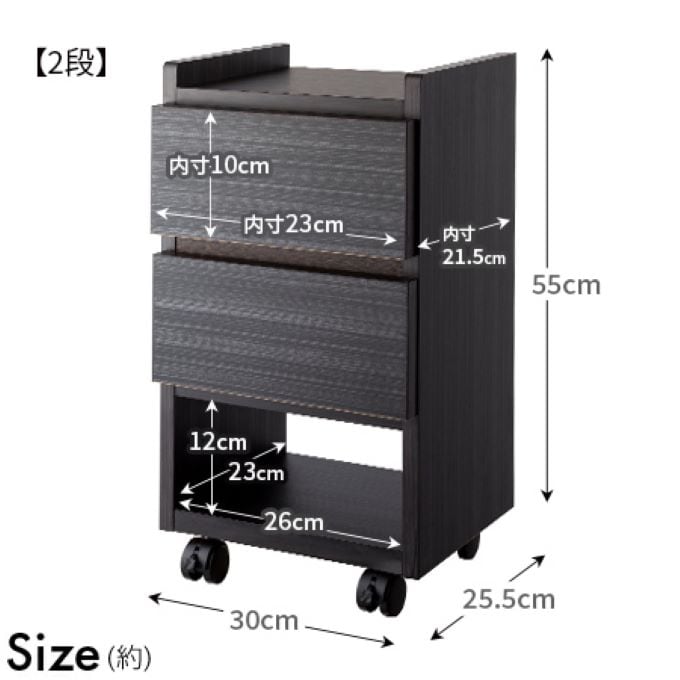 引き出し内寸:1段タイプ:約幅23×奥行21.5cm×高さ18.5cm、2段タイプ:約幅23×奥行21.5cm×高さ10cm