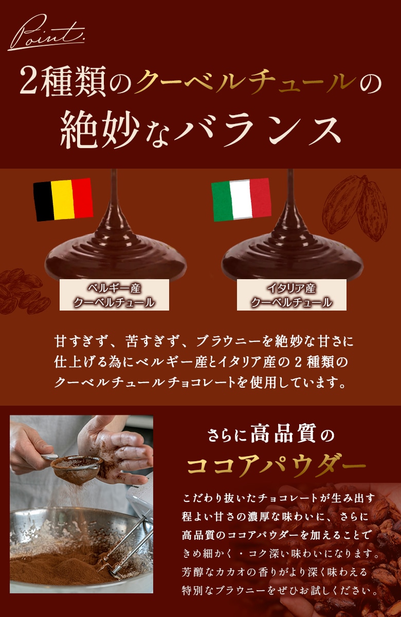 甘すぎず、苦すぎず、ブラウニーを絶妙な甘さに仕上げる為にベルギー産とイタリア産の2種類のクーベルチュールチョコレートを使用しています。