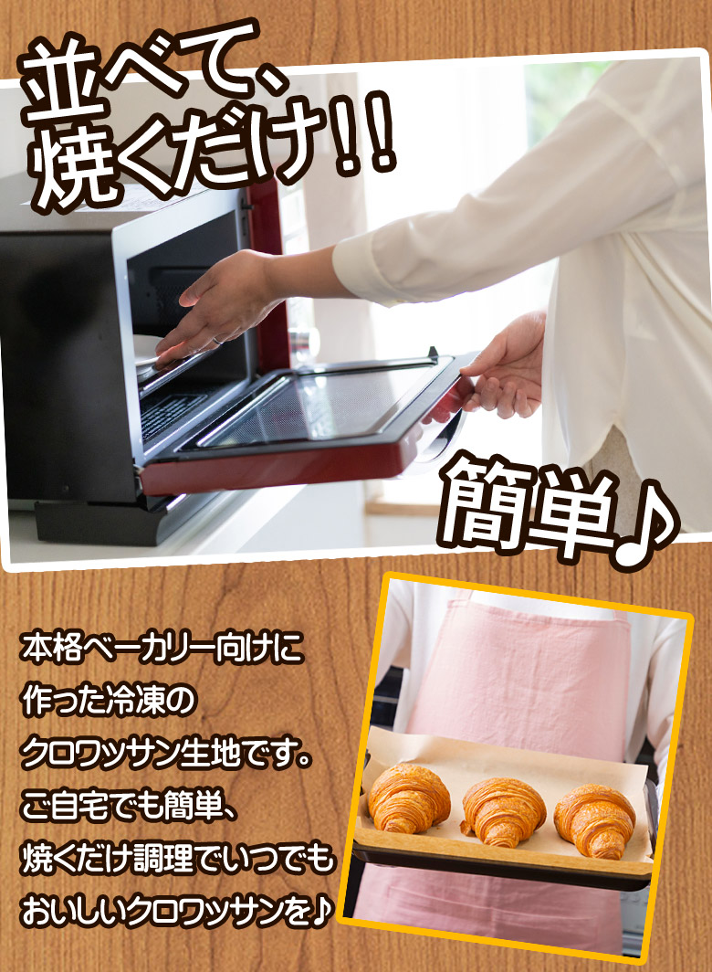 ・お召し上がり方:冷凍のパン生地なので、寝る前に冷蔵庫で解凍して、朝起きたらオーブンで焼くだけの簡単調理でご自宅でも簡単にパン屋さんの焼きたてクロワッサンがお楽しみ頂けます!