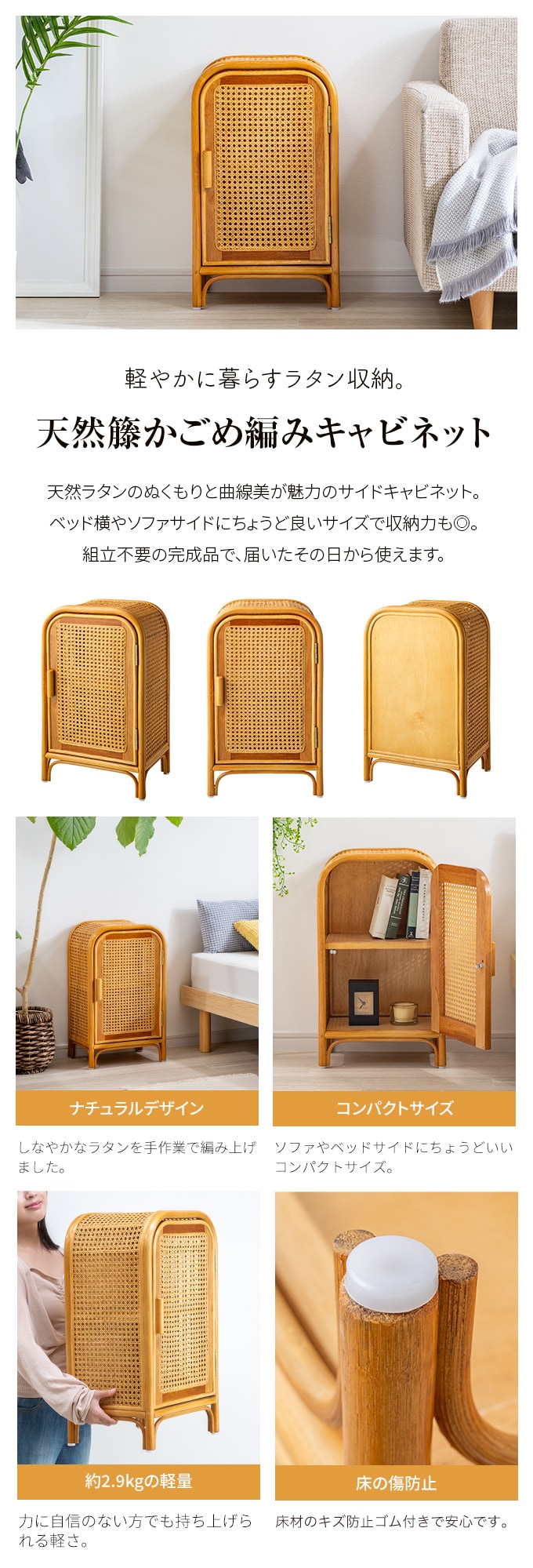 「お部屋の雰囲気を変えたい」「ベッドサイドに置けるおしゃれな家具が欲しい」そんな方におすすめの、天然ラタンの風合いが楽しめるキャビネットです。一つひとつ丁寧に編み込まれたかごめ編みと、丸みを帯びた個性的なフォルムが魅力的。天然素材ならではの温かみと、異なる模様が織りなす風合いが、お部屋にナチュラルでおしゃれな雰囲気をプラスします。ベッドサイドやリビングのちょっとしたスペースに置くのにちょうど良いサイズ感です。