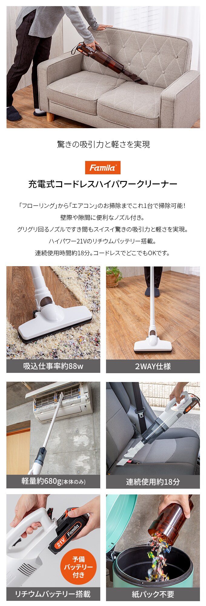 「フローリング」から「エアコン」のお掃除がこれ1台で家中掃除ができます。壁際や隙間に便利なノズル付き。グリグリ回るノズルですき間もスイスイ。驚きの吸引力と軽さを実現。高回転直流モーターで強力な吸引力を生み出すコードレスクリーナーの決定版。紙パック不要で経済的。お手入れ簡単でたまったゴミはポイするだけ。軽いので、持ち運びもラクラク。階段やトイレなどの狭い場所でも、小回りがきいてベッド下もスムーズに掃除できます。着脱が簡単なスライド式バッテリー、ハイパワー21Vのリチウムバッテリー搭載。連続使用時間約18分。コードレスでどこでもOKです。