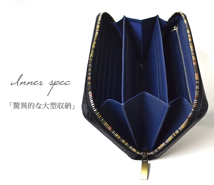 その高級素材を生かし、特大サイズのラウンドファスナー型に仕上げたビッグウォレット。