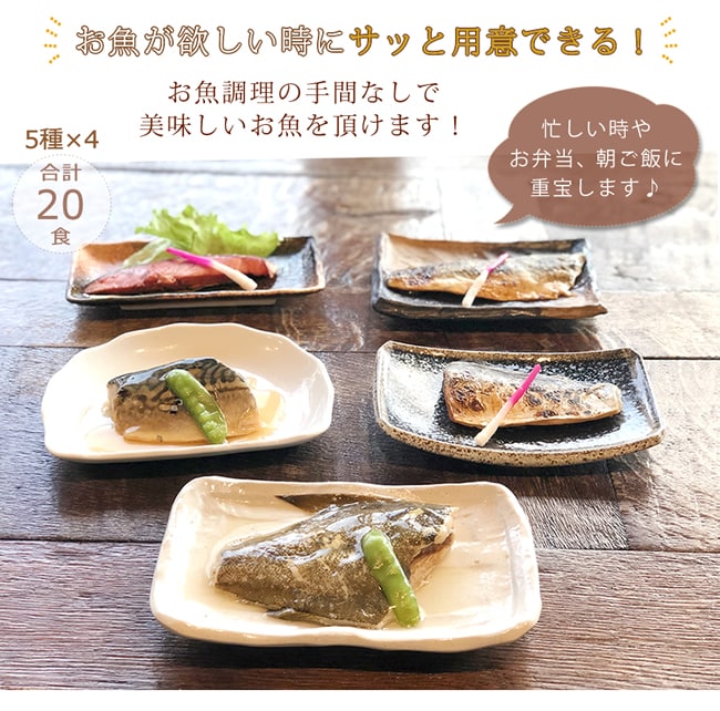 【5種20食】魚三昧セット!手作り京惣菜/お魚が欲しい時にサッと用意できる! | さわら西京漬 | さば西京漬 | 焼鮭 | 鯖の生姜煮 | カレイの煮つけ | 各4食