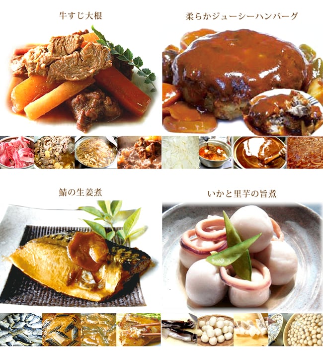 【4種16食】手作り京惣菜Aセット <普段のおかずやお弁当にも便利!> | 牛すじ大根 | 柔らかジューシーハンバーグ | 鯖の生姜煮 | いかと里芋の旨煮 |各4食