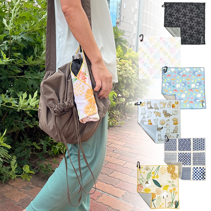 裏面は吸水性の優れたマイクロファイバーのため、濡れた傘や冷たいペットボトルも水滴を気にせず持ち運べます。