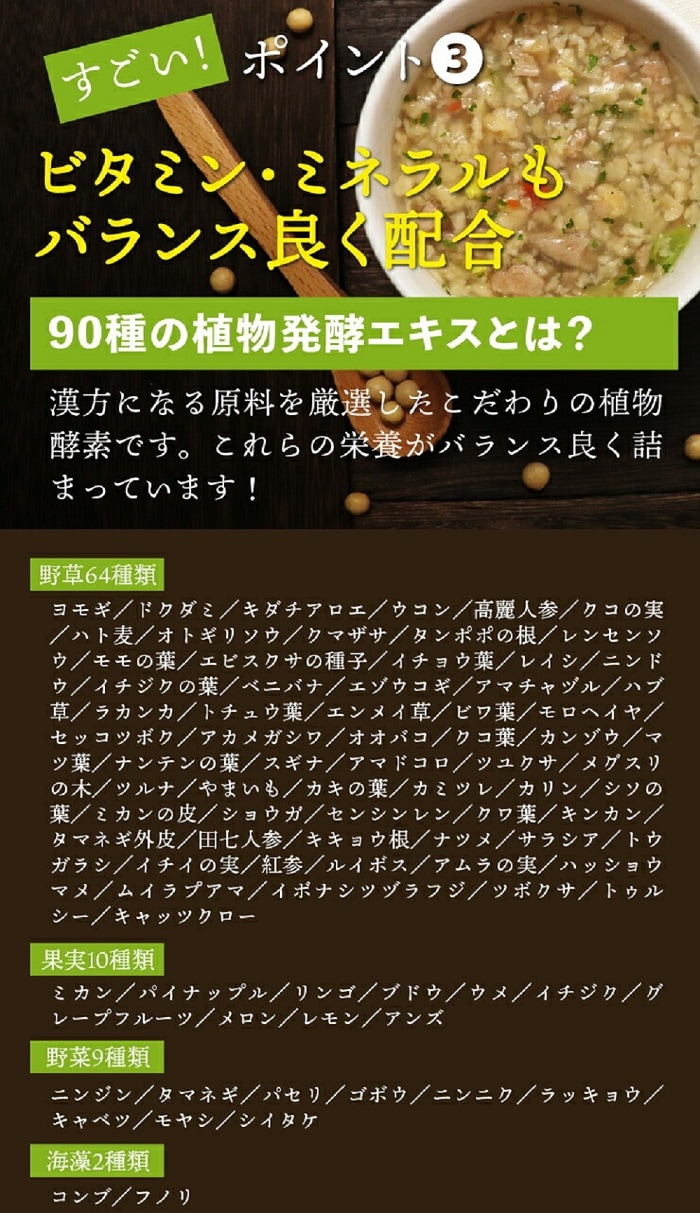 【野菜ポタージュ粉末】豆乳粉末(国内製造)、脱脂粉乳、砂糖、難消化性デキストリン、コラーゲンぺプチド、米麹、食塩、チキンエキス、ポークエキス、ガーリックパウダー、オニオンパウダー、こんにゃく粉末、寒天粉末、90種植物発酵エキス、植物油、具・うきみ(粒状大豆加工品、乾燥キャベツ、人参、ごぼう、たまご、オニオン、椎茸、コーン、ねぎ、ごま、パセリ)/調味料(アミノ酸等)、ゲル化剤(増粘多糖類)、L-カルニチン、(一部に卵、乳、大豆、豚肉、鶏肉、ゼラチン、りんご、やまいも、ごまを含む)