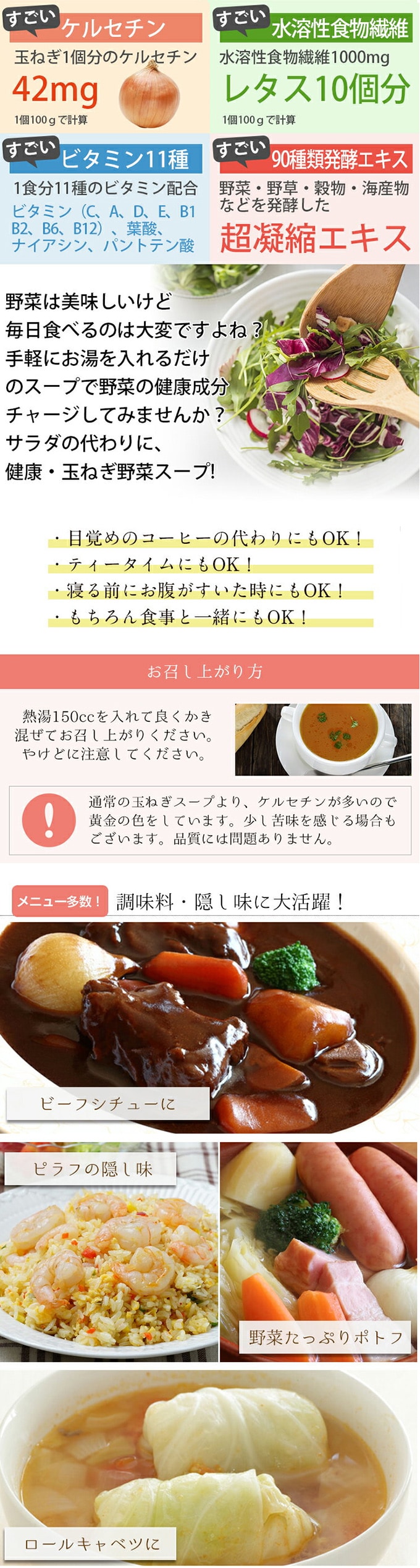 ・原材料/材質/素材:難消化性デキストリン、食塩、オニオンパウダー、砂糖、粉末しょうゆ、チキンパウダー、ガーリックパウダー、ポークパウダー、胡椒、ジンジャーパウダー、90種の植物発酵エキス、うきみ(パセリ)/調味料(アミノ酸等)、ケルセチン、増粘剤(グァーガム)、(一部に小麦・大豆・鶏肉・豚肉を含む)
