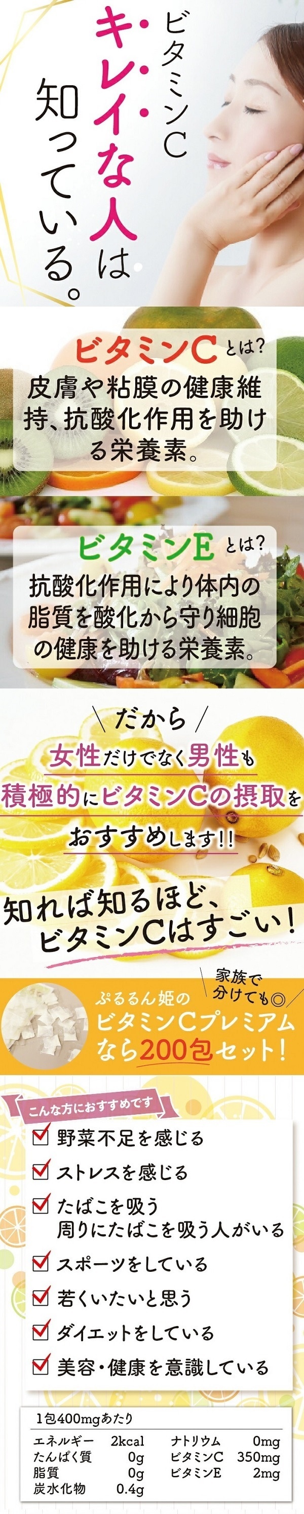 栄養成分(1包400mgあたり) : エネルギー:2kcal、たんぱく質:0g、脂質:0g、炭水化物:0.4g、ナトリウム:0mg、ビタミンC:350mg、ビタミンE:2mg