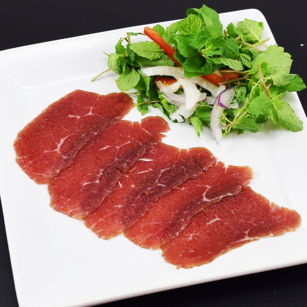 牛肉を塩漬け・乾燥熟成させたものです。豚の生ハム(プロシュット)よりもさっぱりしていて、ヘルシーさも人気です。