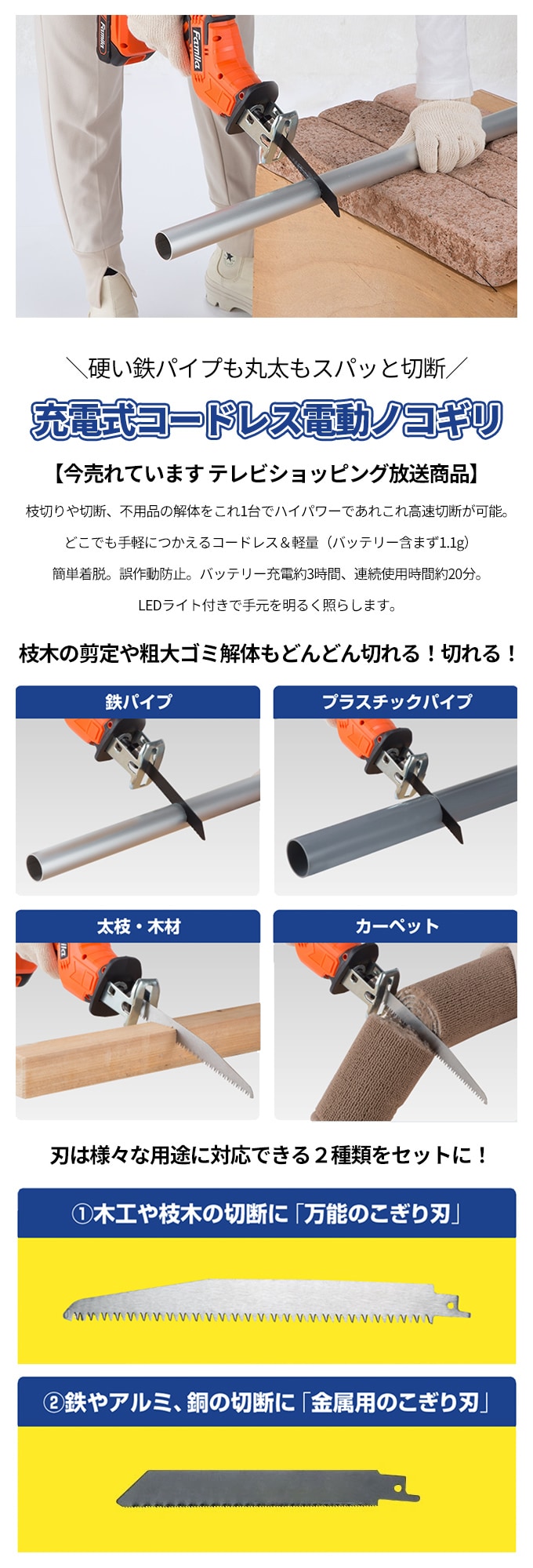 充電式コードレスのこぎり6点セット 専用替え刃2枚 予備バッテリー付き | 電動ノコギリで作業効率アップ!