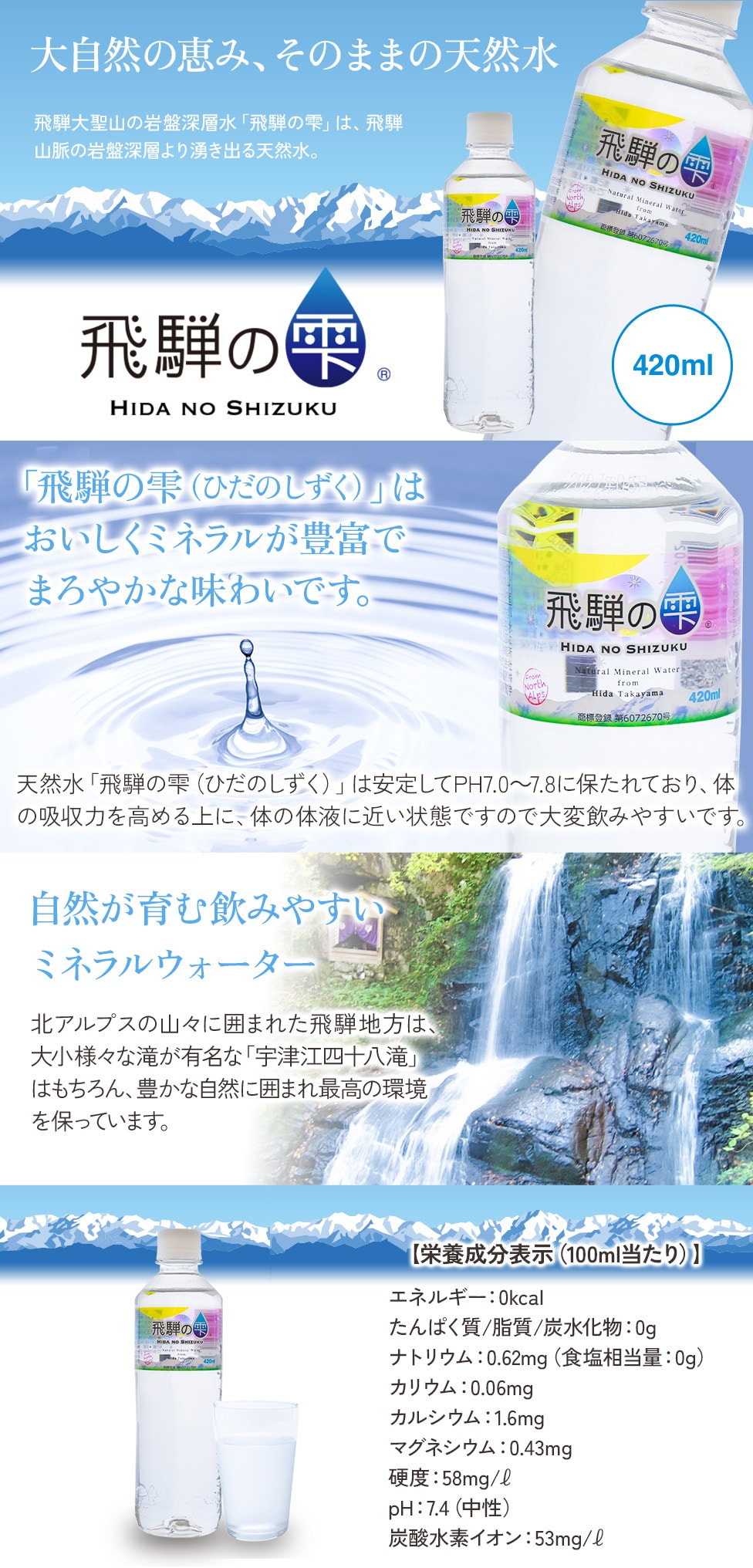 【420ml×28本】飛騨の雫 | 「飛騨の雫」はミネラルが豊富でまろやかな味わいです。