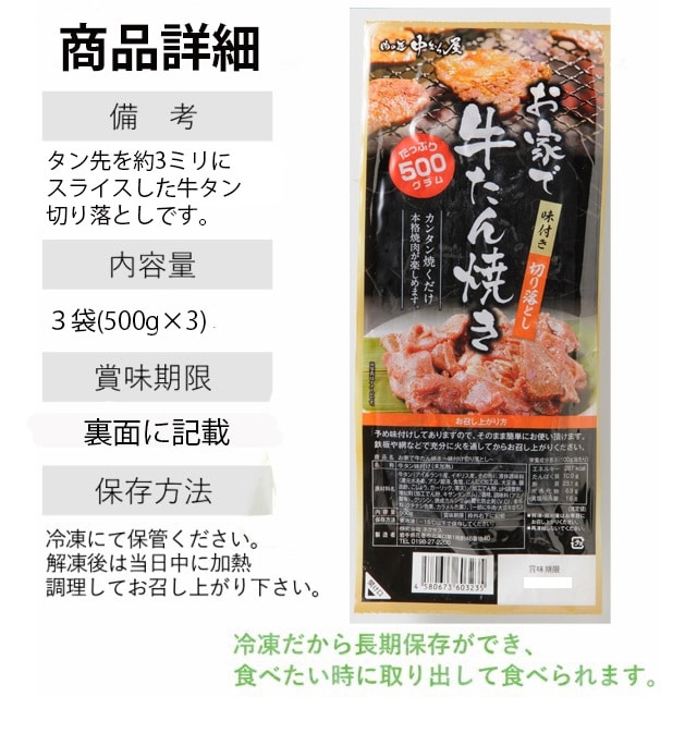 【1.5kg】牛タン切り落とし(3mmスライス)500g×3袋 | フライパンで焼くだけ簡単!塩味付き牛タン切り落とし