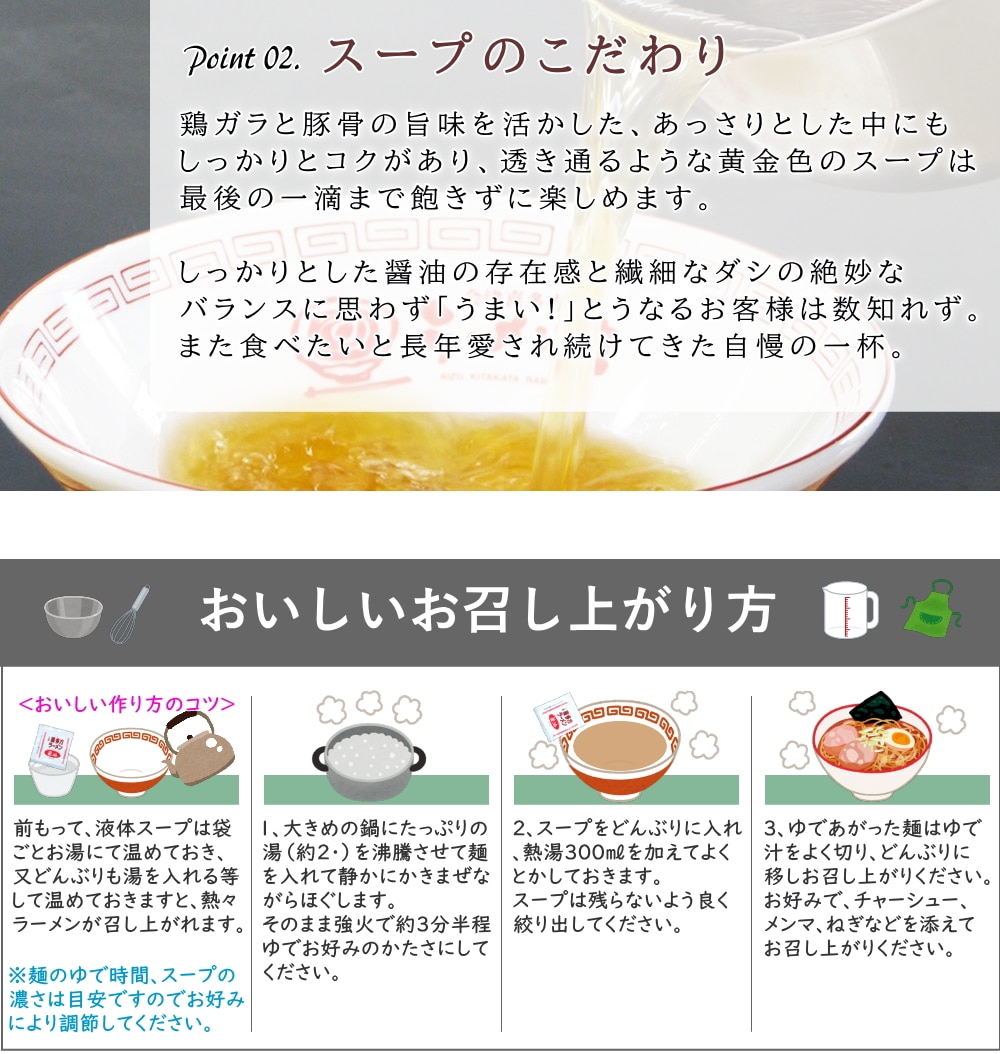 醤油スープ:醤油、食塩、ポークオイル、チキンエキス、香味油、たん白加水分解物、植物油脂、砂糖、香辛料、調味料(アミノ酸等)、酒精、カラメル色素、(原材料の一部に大豆、小麦、鶏肉、ゼラチン、豚肉を含む)